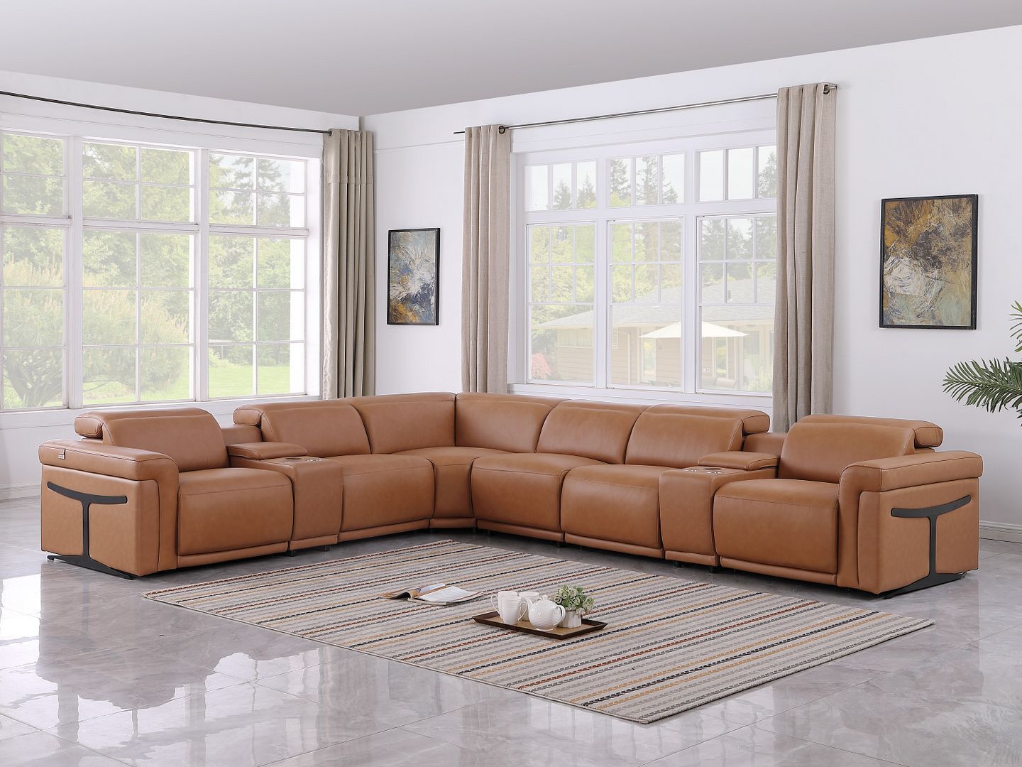 1126 - 7-Piece L-Shaped Sectional Sofa In With 4 Power Recliners & Power Headrests - Cognac