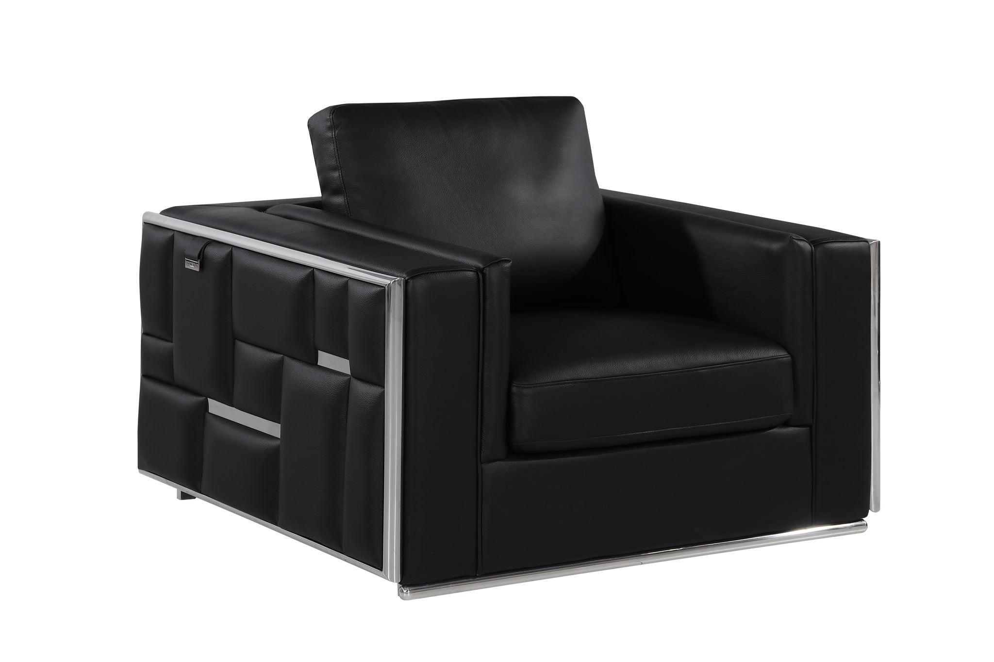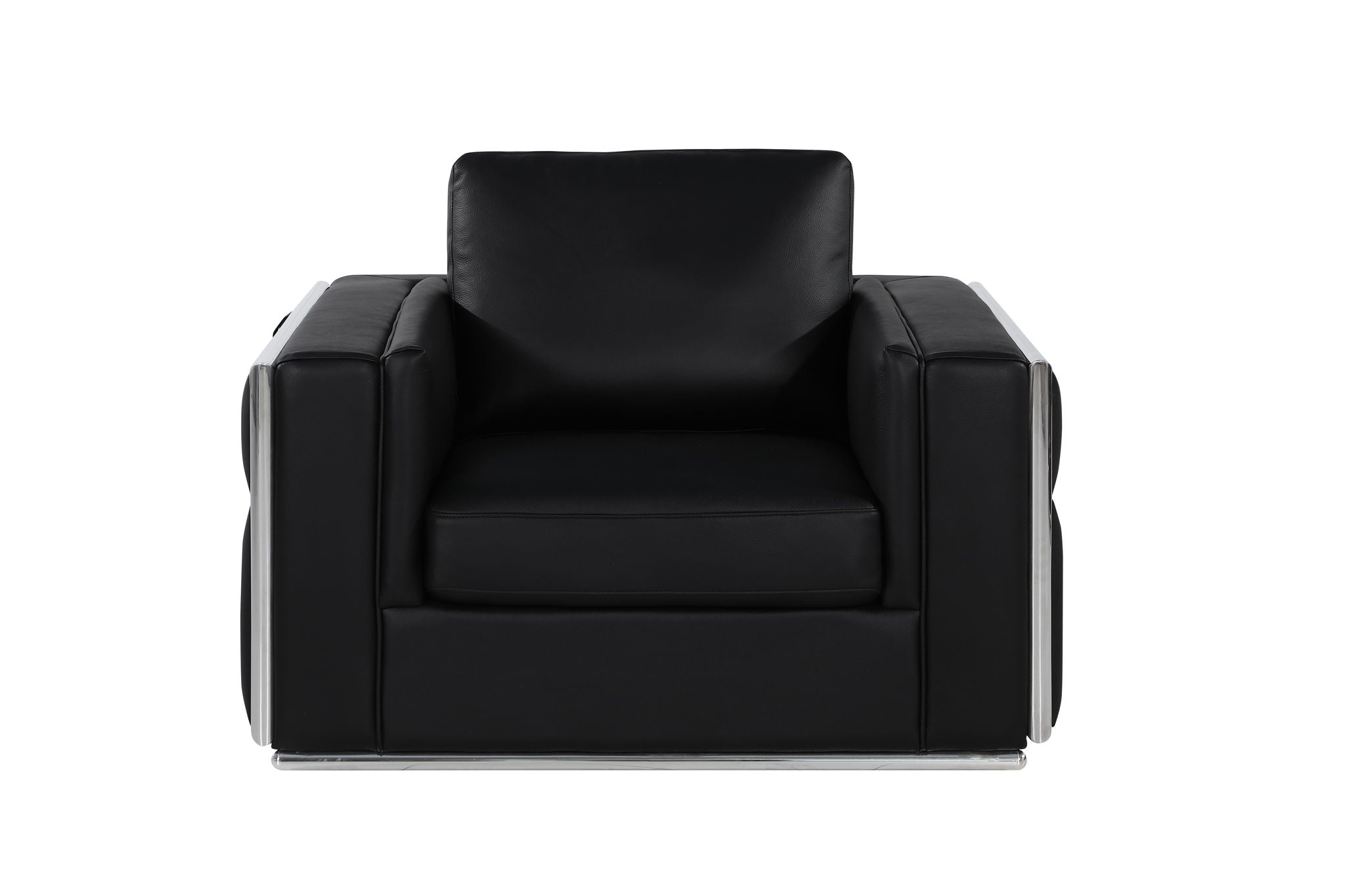 This Modern Top Grain Italian Leather sofa set is crafted using the finest of materials, durable Brazilian solid wood construction, and premium leather. This sofa set is a fine example of modern design. It displays an aesthetically pleasant linear design with chrome accents to foster sophistication. A great way to convey simple luxury in any room. This masterpiece is a delightfully distinguished mix of functionality and style. The chrome trim effortlessly elevates any room with a touch of contemporary design. The cushions easily sit five people in optimal comfort, with the width of the armrests also offering a functional purpose as a perfect place for resting your favorite drink or a book. Starting from the design to the finished product, each step of the production process is checked rigorously for quality. The selection of top-grain Italian leather for the upholstering and solid Brazilian wood for the frame is done with the utmost respect for the finest raw materials. Italy is world-renowned for high-quality leather. You can smell, feel, and see its high quality in every sofa set.
