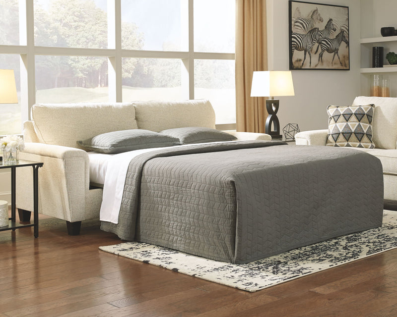 Covered in a chenille upholstery loaded with plush texture, this less-is-more contemporary sofa is dressed to impress with angled side profiling and track armrests wrapped with a layer of pillowy softness for that little something extra. Crisp and clean, the 2-over-2 cushion styling adds up to one sensational look. Rest assured, the memory foam queen mattress comfortably accommodates overnight guests.