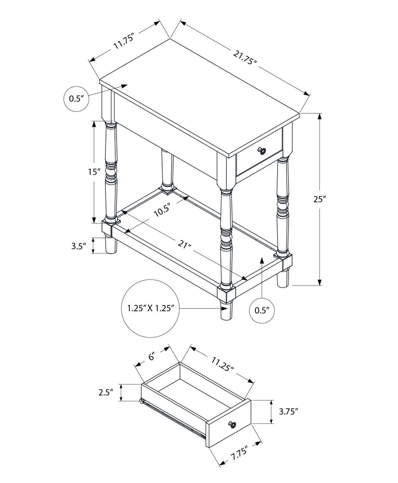 - Functional Storage: Equipped with a storage drawer on metal glides, accented by a metal knob, this table offers a convenient place to tuck away small essentials. The bottom shelf provides additional organization space.