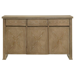 This sideboard combines timeless elegance with practical storage in a distressed light brown finish. Crafted from oak veneer, rubberwood, and engineered wood, it features tinted drawer boxes with brown felt lining and smooth drawer extension glides. The vertical reeding side panels and intricate door fronts add texture and sophistication. With three spacious drawers and three adjustable shelves behind the doors, this sideboard provides ample storage for dining essentials while enhancing your space with refined style.