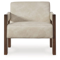 This accent chair is an ultra-contemporary addition to your seating area. Warm hued wood and neutral faux leather harmonize beautifully for a luxuriously welcoming vibe. Whether you're cozying up with coffee or settling in to stream your favorite show, relaxing has never been so comfortably chic.