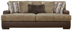 Punctuated by a subtle band of nailhead trim, this sofa is perfect for those who love the look of leather. Two textural tones provide twice the style and comfort—and incorporate an added layer of visual interest. Throw pillows add a fun decorative element.