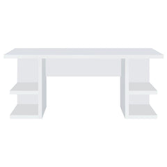 Enhance your workspace with this modern writing desk, featuring a sleek white finish and a spacious design for maximum functionality. The clean-lined silhouette offers a contemporary touch, while four open shelves provide ample storage for books, office supplies, or decorative items. The wide tabletop surface accommodates a large computer setup, ensuring a comfortable and efficient work environment. Designed for versatility, the open leg space allows for easy chair placement. Crafted from durable engineered wood and melamine veneer, this desk is both stylish and built to last.