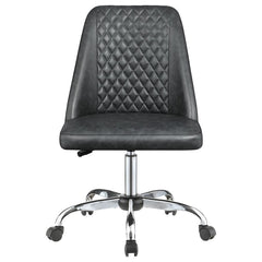 Pull this contemporary accent chair up to a workstation in your home office.Wrapped in a supple leatherette, this office chair features a bucket style seat with a diamond tufted backrest and a smooth cushion.Capable of getting around the office, this chair also features five caster wheels attached to a shiny chrome base.Highly functional, this office chair can also be raised and lowered to suit your existing desk height.Place this stylish chair in a modern home office for comfort and versatility.