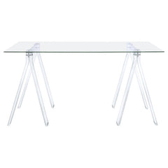 Enjoy an airy workspace with this 59-inch writing desk, pairing a sleek acrylic sawhorse base and a clear tempered glass top. Heavy gauge steel supports, finished in electroplated chrome, connect the legs for added stability and a polished accent. The translucent design keeps your office bright and open, suiting both modern and minimalist décor. Perfect for writing, studying, or creative tasks, this piece merges function and cutting-edge style seamlessly.