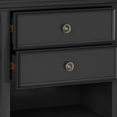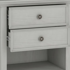 - Features two (2) spacious drawers with metal drawer glides and open bottom storage area
