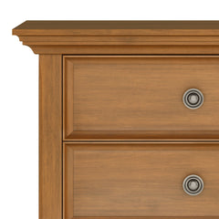 - Traditional design includes tapered legs, molded crown edged table top, panel framed drawer fronts and bronze round decorative pulls