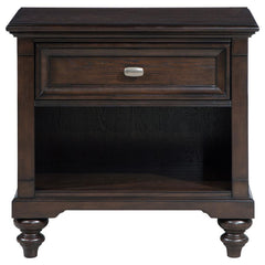 This nightstand combines classic design with modern functionality, making it a perfect addition to any traditional bedroom. The dark oak finish enhances the intricate wood grain, while the single drawer offers convenient storage for bedside essentials. An open cubby below provides additional space for decorative items or books, while the integrated cable management system keeps your electronics organized. Gunmetal hardware adds a touch of contemporary flair to the vintage design. Built with poplar and oak veneers, this nightstand is both functional and stylish.
