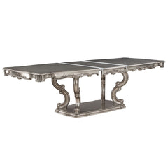 Introducing our Ariadne dining table that is sure to captivate you with its intricate scrollwork and luxurious antique platinum finish. This stunning dining table has a beautifully crafted pedestal base that makes a grand statement on its own. Creating the perfect setting for gathering around friends and family. The table includes an extension leaf that will help you accommodate all your guests.