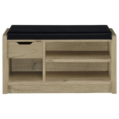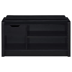 Make your entryway or garage both functional and stylish with this versatile storage bench, designed to keep your space organized. Featuring a foam cushion upholstered in sleek black faux leather, this bench offers a comfortable seat while you put on or take off your shoes. The engineered wood frame, finished with an eco-friendly laminate, offers durability with a modern appeal. The storage includes a pull-out drawer, an adjustable shelf, and an open compartment, perfect for organizing shoes, bags, or other essentials. This bench ensures all your entryway necessities are easily accessible.