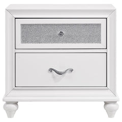 Get ready to add exquisite glamour to your space with this upholstered bedroom set. The dramatic headboard offers incredible contemporary appeal with velvet upholstery, button tufting, crystal-like accents and hand-applied nailhead trim with a chrome finish. The matching nightstand comes equipped with a crocodile textured door panel and a glimmery chrome top drawer panel. The seven-drawer dresser with mirror and optional five-drawer chest offers the same texture and sparkly finish. Sleek chrome bar pulls perfectly complement the tapered legs on the panel bed and the bun style feet for the storage pieces.