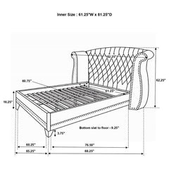 Instantly achieve an elegant upgrade for your sleeping space with this upholstered velvet bed. A dramatic wingback headboard creates a focal point you can't forget. It is adorned with button tufting and crystal-like accents. Nail head trim further enhances this piece on the headboard as well as the frame. It is supported on sleek tapered legs for an extra stylish appeal.