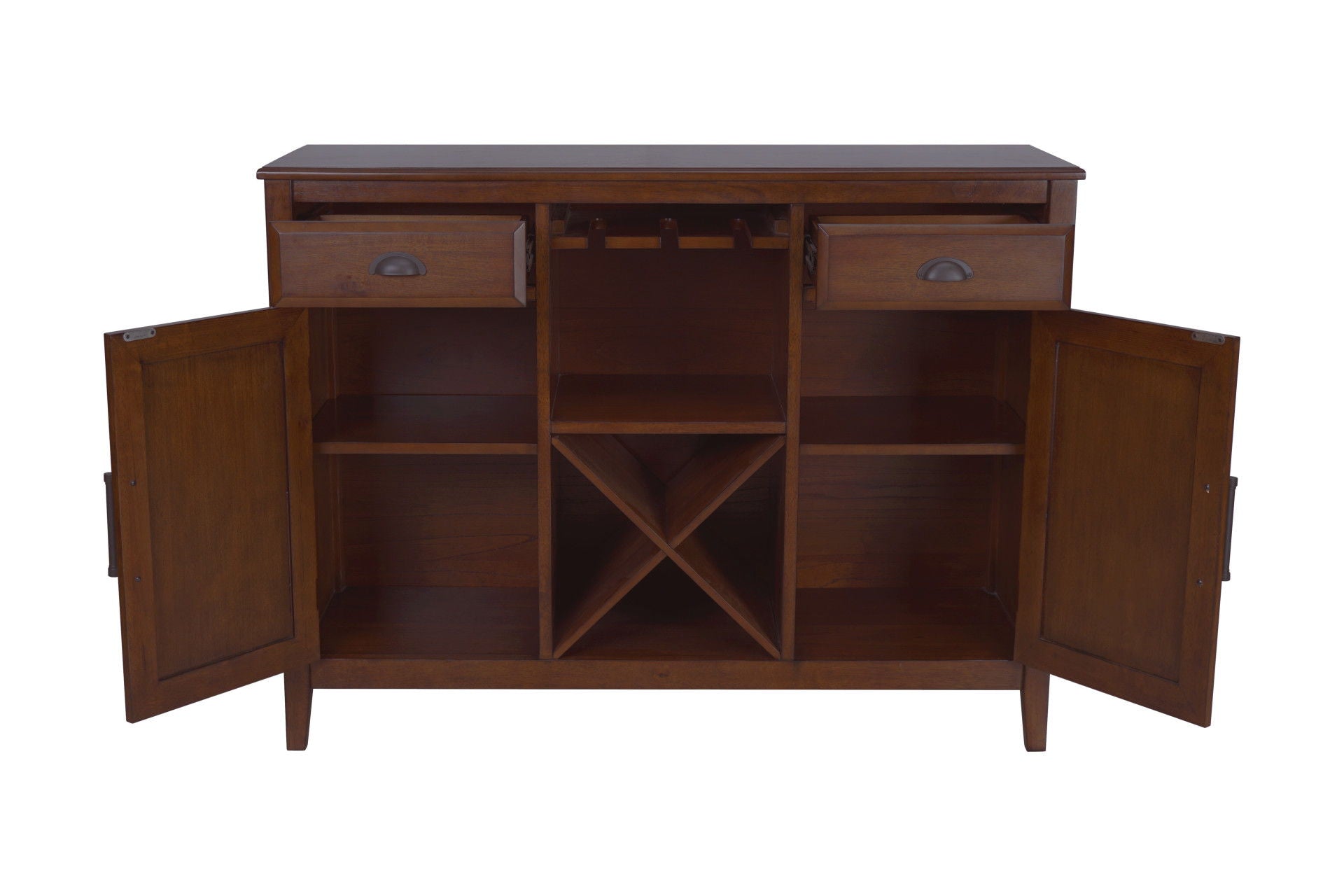The Bixby Dining Server/Buffet Chest in Espresso is a versatile and stylish addition to any dining or entertaining space. Expertly crafted from solid Rubberwood, manufactured woods, and real wood veneers, this server is built to last while preserving the timeless beauty of natural wood. The rich espresso cherry finish, meticulously applied in a multi-step process, accentuates the wood's natural grain and adds a subtle, sophisticated sheen. This sideboard is designed with both functionality and aesthetic appeal in mind, offering ample storage space with a built-in stemware holder and wine cubby, making it easy to keep your dining essentials organized and accessible. Whether used for everyday storage or as an elegant centerpiece during gatherings, this buffet chest combines practicality with a refined look that enhances any space.
