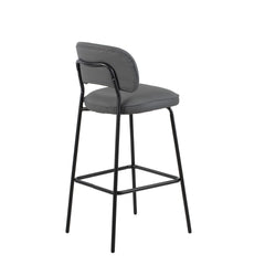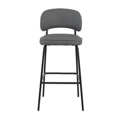 The Blythe Gray Faux Leather Bar Chair set delivers a perfect blend of style and function, making it an excellent choice for any modern space. Each set includes two bar chairs with a sleek, arched back and low profile that brings a contemporary touch to your home or bar area. The gray vegan leather offers the luxurious look of real leather without the upkeep, providing a durable and eco-friendly seating option. The sturdy black iron legs ensure exceptional stability and resist bending or breaking, while the contrast between the dark legs and the gray upholstery adds a refined aesthetic. Dual-purpose footrests add both support and a comfortable spot to rest your feet. A stylish and practical addition, these chairs are built for comfort and lasting appeal.