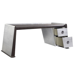 The Brancaster Aluminum Desk's modern look and industrial styling are evident in distress chocolate top grain leather top, aluminum over plywood construction, and exposed rivets that form a patchwork over the frame. A brilliant addition to your workspace, this desk features a generous working area, a unique, angled base, and two side drawers.