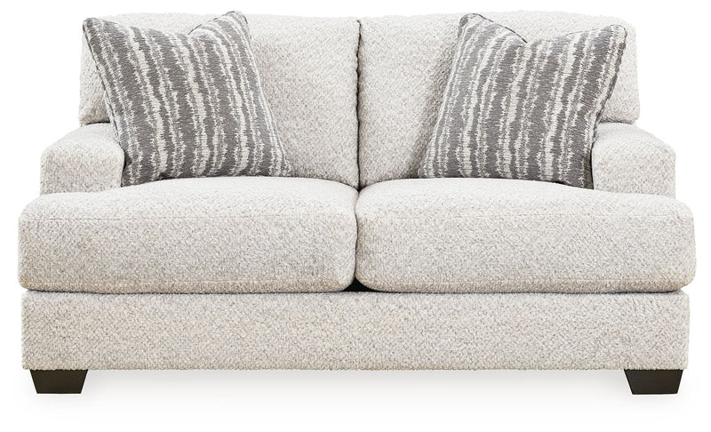 This loveseat speaks to those drawn to fresh, contemporary style with richly neutral appeal. Wrapped in a wonderfully plush fabric loaded with multi-tonal interest, this on-trend piece has a warm, welcoming charm. Coordinating accent pillows add to the indulgence. Kick back, relax and settle in for comfort with this cool addition for modern spaces.