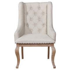 Go full-scale indulgent with this inviting dining arm chair. Beautifully upholstered in a neutral tone, the chair features sloping arms that draw the eye and offer superb comfort and support. Its button tufted back lends classic style. Nailhead trim creates definition while adding a touch of charming character.