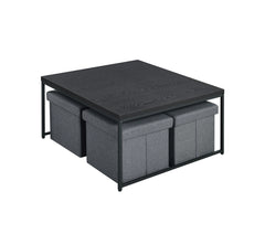 - Looking to style your living room all the while keeping it decluttered? The Caitlin collection is just the set for you! The Caitlin collection manages to be stylish and compact. Featuring a stunning wooden tabletop and metal frame, this coffee table is sure to become the envy of your peers. Keeping your living space clear of clutter has never been easier with the included storage stools. Invite your friends and family for a cup of coffee and enjoy chatting as they complement your sleek, minimalist, and functional coffee table.