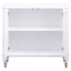 Put the last touches on a stylish space with the added storage and impeccable style of a modern accent cabinet. Featuring two decorative magnetic push-to-open doors, it's the perfect addition in any space, offering ample interior space with an adjustable shelf. The top creates space for decor or to highlight beautiful artwork hung above. The cabinet boasts a crisp white finish, bringing light, refined character to a pair of floral medallion doors. Curvy legs feature silver-toned caps, adding a hint of contrast and dimensionality in any room.