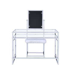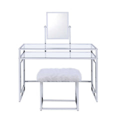 Offering plenty of storage with its contemporary style, this Carenze II vanity desk with 1 open compartment & tilt mirror is a perfect choice for getting ready in the morning. Image sitting down in front of this lovely vanity desk to apply your makeup and do the grooming while the sunlight shine in through the window, isn't it wonderful? Manufactured with chrome metal and covered with chrome & white fur, this vanity set combines elegance with fashion. Coordinate with its matching stool, it will moreover add superiority to your room.