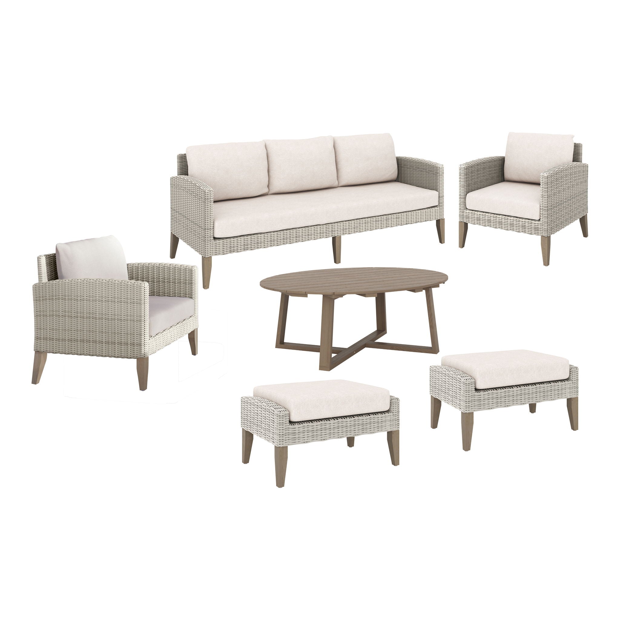 Introducing the Carezza Outdoor Collection, where durability meets comfort in a seamless blend of style and functionality. Crafted with precision using FSC Certified Acacia solid wood, weather-resistant wicker, and aluminum frames, this collection stands the test of time, promising years of outdoor enjoyment. The color fast, weather-resistant fabric, made of solution dyed 100% Polyester, ensures vibrant hues that resist fading, mold, and moisture, keeping your furniture looking fresh season after season. Sink into the lap of luxury with the high-density, 12cm foam seat and back cushions, providing unparalleled comfort for hours of relaxation. With its relaxed transitional style, featuring light wicker and wood finishes complemented by soothing taupe fabric, this set effortlessly transforms your outdoor space into a casual, welcoming retreat. Assembly is a breeze, taking approximately 45 minutes to secure legs to all five pieces, with clear instructions provided for your convenience. Elevate your outdoor living experience with the Carezza Outdoor Collection, where every piece is meticulously designed for your comfort and enjoyment.