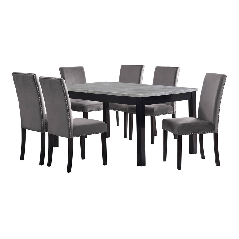 The Celeste 7-Piece Dining Set is a picture of modern luxury and enduring craftsmanship. This set includes a striking 64-inch dining table with an espresso base and a faux marble top, accompanied by six exquisite gray velvet chairs. Crafted from solid Rubberwood and manufactured wood components, the dining set is designed for longevity, ensuring a timeless addition to your dining space. The glossy finish on the tabletop provides heat and water resistance, ensuring easy cleaning and protection from wear. The white and gray veined faux marble top, set against deep espresso legs, creates a contemporary and glamorous ambiance. Luxurious seating awaits with the soft and durable 100% polyester velvet fabric covering sumptuous memory foam cushions, offering both comfort and easy maintenance. Tailored for elegance, the rich and luxurious colors of the velvet chairs are enhanced by silver nailhead trim, providing a sparkling final touch to this impeccable dining set. Enjoy the fusion of contemporary glamour and enduring quality with the Celeste dining collection.