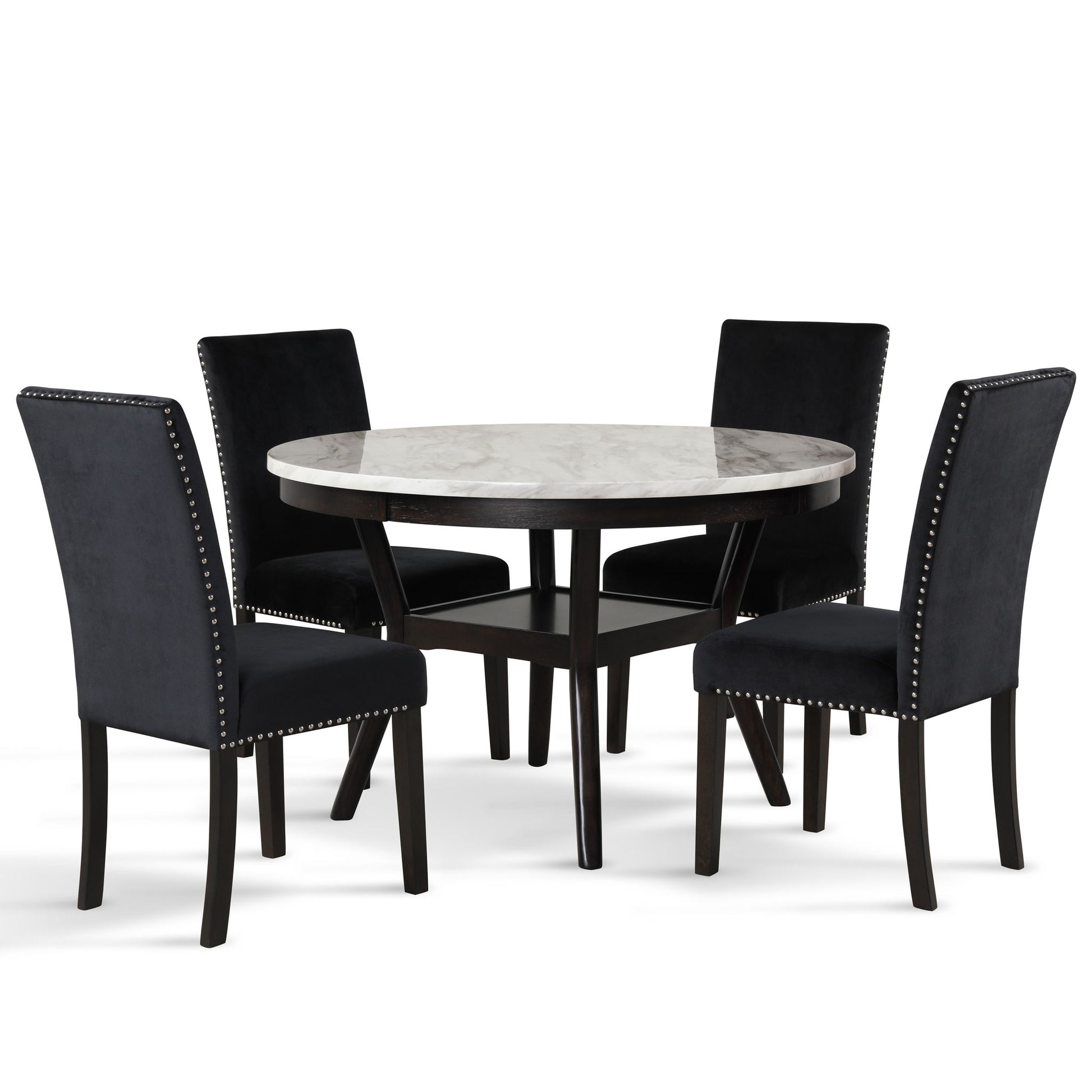 The Celeste 5-Piece Dining Set is an exquisite combination of modern sophistication and enduring craftsmanship. This set includes a chic round table with an espresso base and a faux marble top, accompanied by four stunning black velvet chairs. Crafted from solid Rubberwood and high-quality manufactured wood components, the dining set is designed for longevity, ensuring a lasting addition to your dining space. The glossy finish on the tabletop provides both heat and water resistance, ensuring easy cleaning and protection from wear. The white and gray veined faux marble top, complemented by deep espresso legs, creates a contemporary and glamorous ambiance. Luxurious seating awaits with the soft and durable 100% polyester velvet fabric covering sumptuous memory foam cushions, offering both comfort and easy maintenance. Tailored for elegance, the rich and luxurious colors of the velvet chairs are enhanced by silver nailhead trim, providing a sparkling final touch to this impeccable dining set. Elevate your dining experience with the Celeste dining set—a fusion of contemporary glamour and enduring quality.