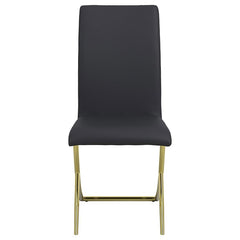 Embrace contemporary elegance in the dining room with this armless dining chair. The sleek design boasts a gracefully contoured leg frame with an upholstered seat and back. The classic glamour of a shiny brass finish on the legs complements the leatherette upholstery. Choose the color that suits your decor, or mix and match for a fun look. Perfect with a glass top dining table for a dramatic contemporary feel.