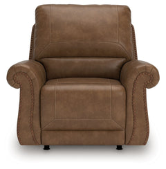 Everyone can have the best seat in the house with this swivel glider recliner. Its nailhead trim puts the finishing touches on the traditional roll arms you love. The recliner's comfy, durable cushions—wrapped in a rustic yet sophisticated faux leather—keep you feeling relaxed, while its turned legs show that style and quality flow from top to bottom. Plus the smooth reclining motion and 360-degree swivel keep you in the flow of conversation.