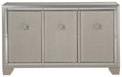 Reflect your love for contemporary style with this accent cabinet. It features a mirrored top and beveled mirror accents, adding both light and a touch of glam to your space. Decorated with faux crystal and chrome-tone pulls, the textured silvertone door fronts open to reveal adjustable shelving to meet all your storage needs.