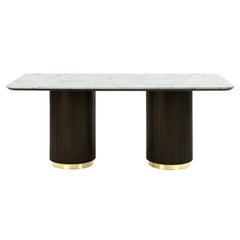 Clayten collection exudes elegance with its rectangular dining table featuring a fixed white marble top and double pedestal base with metal trim. Paired with upholstered chairs and a server with metal legs, this set blends sophistication and contemporary style. Perfect for hosting elegant dinners and creating memorable moments, the Clayten collection brings luxury and comfort to your dining space.