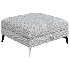 Function and fashion mix with a delightful result in this modern storage ottoman. Brighten a sofa set or sectional with a square ottoman adding plenty of surface and storage space. Covered in fabric with a compelling geometric design, its gray-centered palette blends with a mix of pieces in a living room or bedroom. A fully enchased engineered wood frame with stylish black metal legs and a black lined interior adds a tasteful angle, while a looped handle easily lifts its upholstered top. Use this storage ottoman as a footrest or for extra seating.