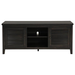 Upgrade your entertainment space with this stylish 60-inch TV stand, designed to accommodate TVs up to 65 inches. With two louvered doors, it combines classic charm with modern functionality, offering concealed storage for media equipment and accessories. The central open shelving provides easy access to devices, while cord management cutouts behind each compartment ensure a neat and organized setup. The rich wood finish, combined with a planked top, adds a touch of rustic sophistication to any room. Perfect as a TV stand, storage cabinet, or buffet, this versatile piece balances style and practicality in equal measure.