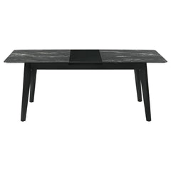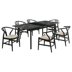 Envision your gatherings transformed with this exquisite dining set, where the sleek lines of modern design meet the timeless allure of faux marble. The table's luxurious marble-esque top is a symphony of style, supported by fin-style legs that ground it with a touch of sophistication. As your ensemble grows with the seamless self-storing extension, the dining tableau adapts, offering a spacious stage for both feasts and intimate conversations. Accompanying the table, the Danish Y-shaped wishbone chairs, dressed in black and beige, whisper of coastal breezes and relaxed elegance, their form both a nod to tradition and a statement of contemporary grace. This dining set doesn't just host meals; it curates experiences.