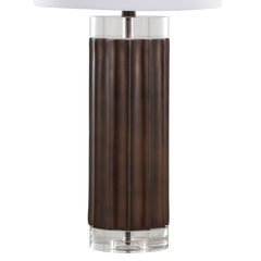 - Elegant Design: The Cylinder Fluted Table Lamp features a ribbed polyresin body with a lustrous brown finish, accentuated by crystal cylinders, offering a chic and minimalistic aesthetic suitable for various spaces.