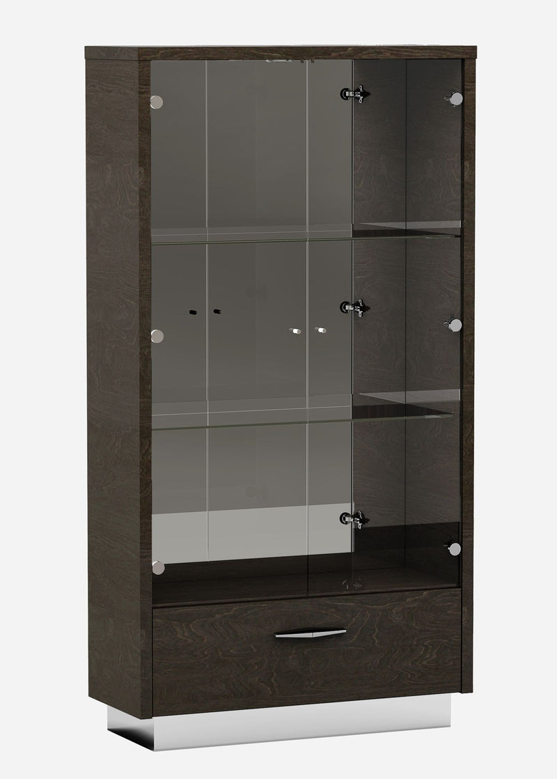 Modern Extendable Dining Table D845 by Global United. D845 is a large and beautiful dining furniture collection, made in Dark Velvet Birch High Gloss lacquer. Dining Table features pedestal base and is offered with extension. Chairs feature Eco-leather upholstered seat that is super easy to clean. D845 dining set also has matching buffet, mirror, and 2-Door Curio Cabinet. This collection is designed in Italy, the modern silhouette fits in well with the rest of the modern furnishings. All pieces can be sold separately.