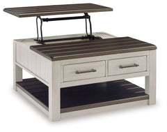 Make a farmhouse-inspired statement with this coffee table. Beautifully crafted to stand the test of time, the planked look and clean two-tone finish lend a relaxing vintage feel. A clever lift-top section and spacious storage drawers double up on form and function.