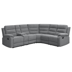 Wrapped in cool smoke color performance linen-like fabric, this modern three-piece motion sofa sectional creates a comfy venue for hosting large groups or intimate gatherings. Relax on a sofa offering manual reclining features and a wall-hugger design that saves space. Attractive horizontal channeling of soft smoke finish upholstery brings a dimensional look to this sofa, aligning with padded arms that embellish a luxurious feel. The stability of pocket coil springs in each chair space carve out extraordinary comfort. Outfitted with a lift-top console concealing storage space and removeable stainless cups in holders, it adds a go-to set of qualities perfect for today’s casual or semi-formal living spaces.
