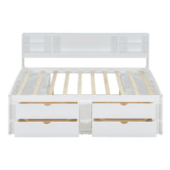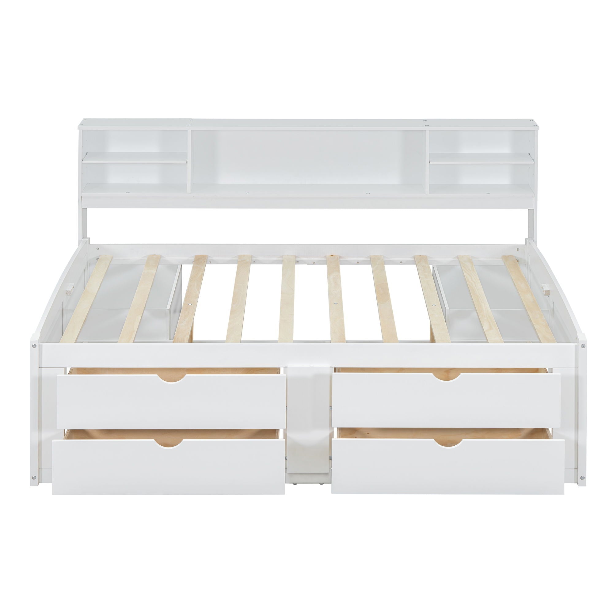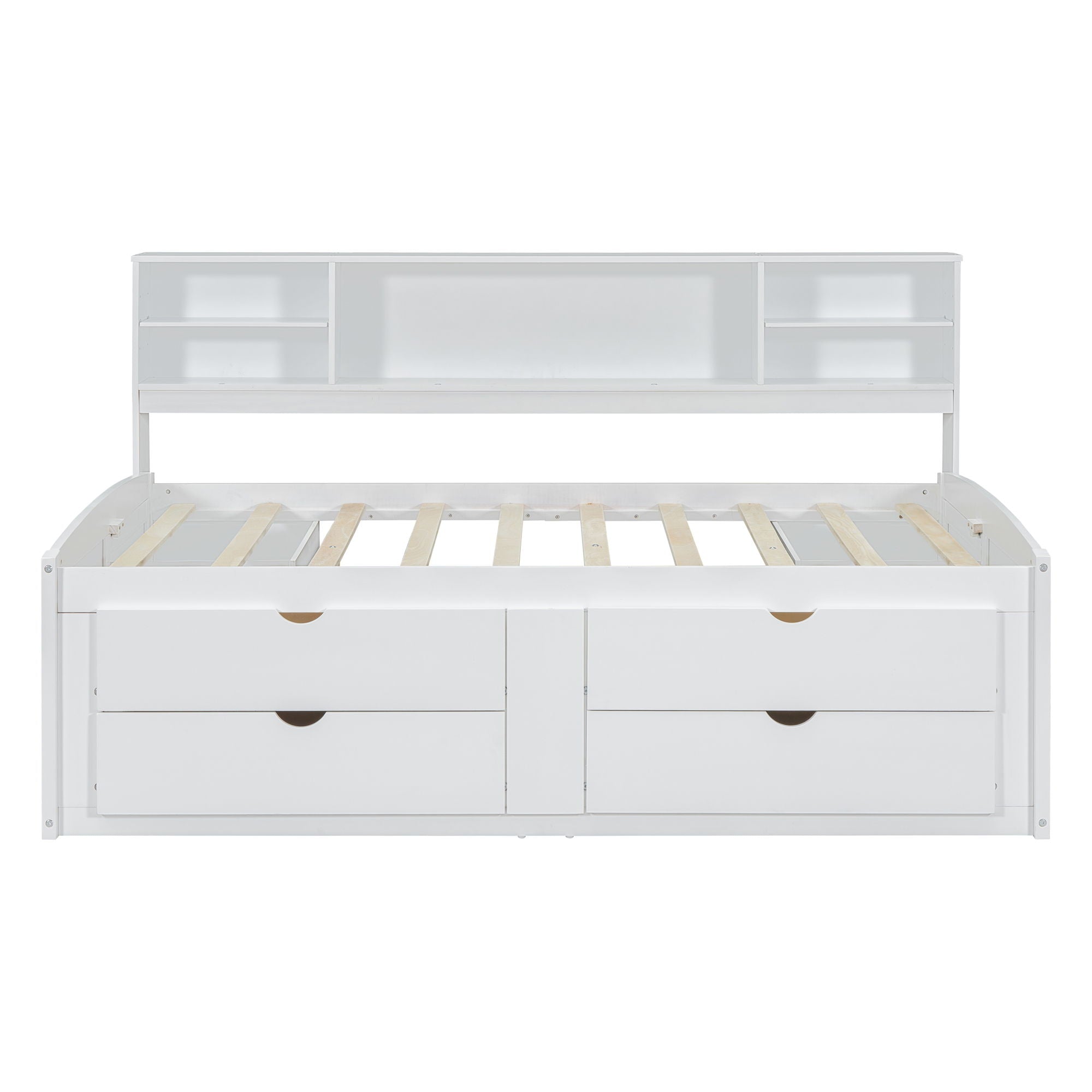 Full Size Daybed With 2 Bedside Cabinets, Upper Shelves And 4 Drawers - White