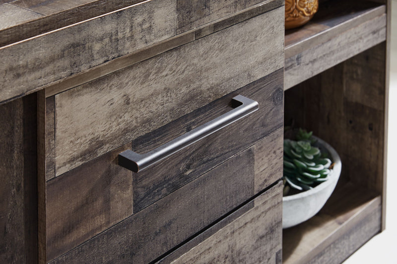 Make this TV stand with fireplace option the center of attention with its urban eclectic style. Its rustic finish over a replicated pine grain creates an authentic natural look for your home entertainment area. You'll love its functionality. Open and closed-door storage with adjustable shelving accommodates media needs.