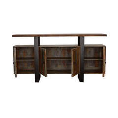 Cozy and rustic, this grey sheesham server is full of charm. Perfect for a contemporary space, the elongated lines on the front feature a sleek black finish. Variations in hue and in wood grain offer a stunning visual that looks great on its own or when topped with stylish sculptures or small, decorative pieces. Complete with four cabinet doors with minimalist-inspired hardware, this server creates a beautiful visual. Serve in style with the open legs and raised table top.