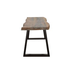Bring a touch of organic beauty and modern edge to your dining space with this solid sheesham wood dining bench. Featuring a live edge seat, each piece showcases unique natural grain variations for a one-of-a-kind look. The black powder-coated metal base provides sturdy support with a sleek, angular design that enhances its contemporary appeal. Perfect for seating two to three guests, this bench is a versatile addition to rustic, industrial, or modern dining settings.