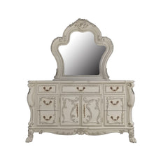 The Dresden Dresser/Server is crafted with the finest solid woods with veneers. Dresden Collection is enhanced by remarkable marquetry and generously carved wood elements. The case goods feature solid hardwood with five drawers and two door with shelf for storage with coordinating carvings. The drawers feature dovetail construction and are decorated with antique brass hardware. This beautiful Dresden Bedroom Collection will add magnificence to your bedroom!