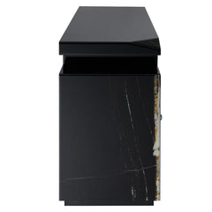 Drisana TV stand with fireplace offers a blend of contemporary luxury and practical functionality. Featuring a sleek black mirrored surface with a sophisticated marble grain design, this rectangular TV stand accommodates up to a 60" flat panel. It includes a cozy firecore fireplace and two doors for additional storage. Enhance your living space with the elegant and modern Drisana collection, combining style and warmth seamlessly.