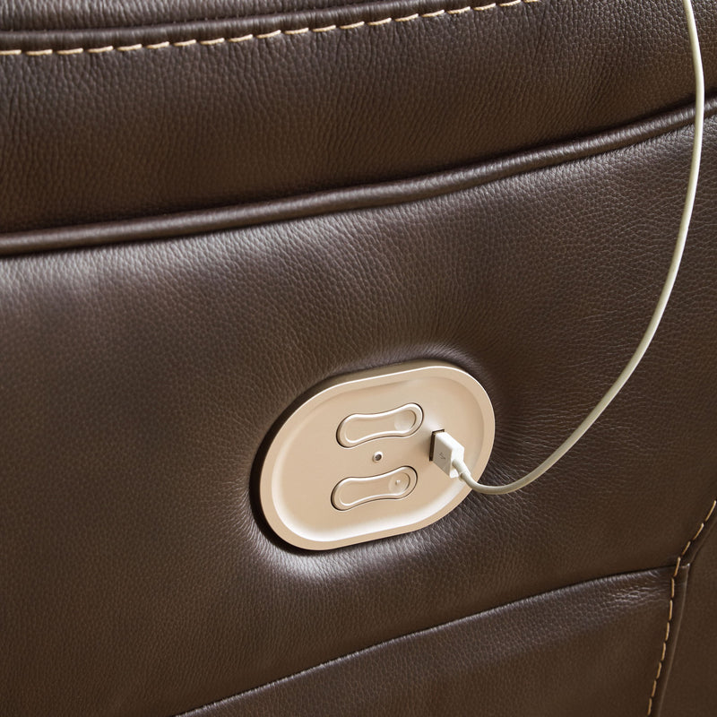 Load up on comfort in a cool, clean-lined and contemporary way with the Dunleith power reclining sectional. Rest assured, you'll enjoy the feel of real leather everywhere your body touches (real leather interior seating/matching faux leather exterior). With a wonderfully soft hand, the heavyweight material is enriched with a pebble grain effect for authentic appeal and enhanced with jumbo stitching for dramatic contrast. It features a one-touch power control with adjustable positions and includes an Easy View™ adjustable headrest that allows a primo view of the TV even when you're reclined. Extended ottomans provide extra length for leg comfort. A zero-draw USB plug-in at your fingertips lets you charge up as you chill out.