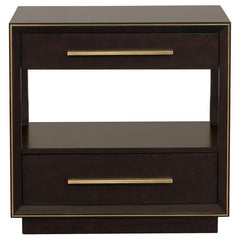 Complement your stylish bedroom with the addition of a modern two-drawer nightstand. It's got an approachable look and feel, complete with easy storage and a full open shelf that creates the perfect spot for books or an e-reader. Use the drawers to organize overnight essentials and personal items and choose the perfect table lamp to suit your style. The front of the case features mitered trim that adds dimension and depth. Extra-long bar drawer pulls contribute a hint of structure in an architectural presentation that's sure to impress.