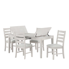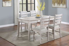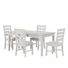 The Echo Dining Set includes a 66" table and side chairs, blending rustic charm with modern function. Crafted from solid Rubberwood, engineered woods, and Oak veneers, it offers durability and style. A multi-step driftwood finish enhances the wood grain with pale gray and white wash tones. The table features a sleek silhouette, a central storage drawer, and lift-top compartments. Classic ladderback chairs with padded upholstered seats ensure comfort and support, making this set ideal for gatherings.