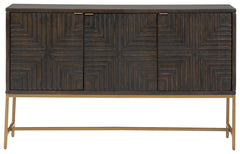 This accent cabinet is a versatile stunner with 3 geometric patterned door fronts in warm dark brown accented with goldtone finish metal hardware. Standing on a goldtone metal open frame base, the three-door console is aesthetically contemporary and sophisticated, ready to serve as buffet, console or media cabinet.