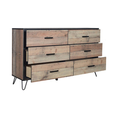 The Elk River Six Drawer Large Dresser is a standout piece that beautifully marries modern industrial design with classic durability. Constructed from eco-friendly manufactured woods and an environmentally conscious decorative laminate, this dresser is designed to withstand the test of time. Its rustic brown finish gives it a weathered, heirloom quality that adds character and charm to any bedroom setting. With six spacious drawers, this dresser offers ample storage space for all your clothing and accessories. Each drawer is built with English dovetail joinery and features Kenlin center drawer glides, ensuring smooth operation and stability. The robust metal legs and cast iron trims enhance the dresser's industrial appeal, creating a striking loft atmosphere that is both stylish and practical. Perfect for those who appreciate a blend of aesthetic allure and functional design, the Elk River Six Drawer Dresser is an excellent choice for organizing and enhancing your space.